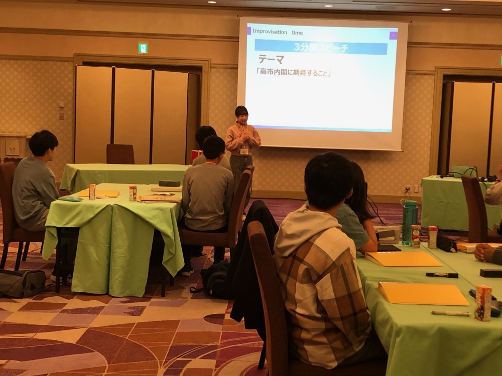 本日の最初のワークショップはインプロ。インプロとは、「即興」を意味する「Improvisation(インプロヴィゼーション)」の略です。もともとは音楽、演劇、ダンスなどの芸術分野で、台本や楽譜に頼らず、その場で自由に創造する表現手法を指します。咸臨丸のインプロではテーマが示され、それについて3分間スピーチを「即興で」行います。