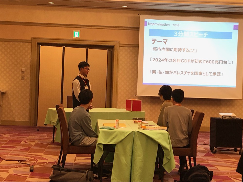 名前入りのボールを箱から取り、そこに書かれた方がスピーチします。今日のテーマはいずれも話題になっているものばかりです。特に就任されたばかりの高市首相は、10月24日に所信表明演説をされています。急なインプロでしたが、3名の皆さんは何とか自分なりの考えをスピーチできました。今後は、普段から時事問題や国際情勢に関心を持つようにしましょう。少なくても新聞のヘッドラインだけは確認するようにしていきましょう。