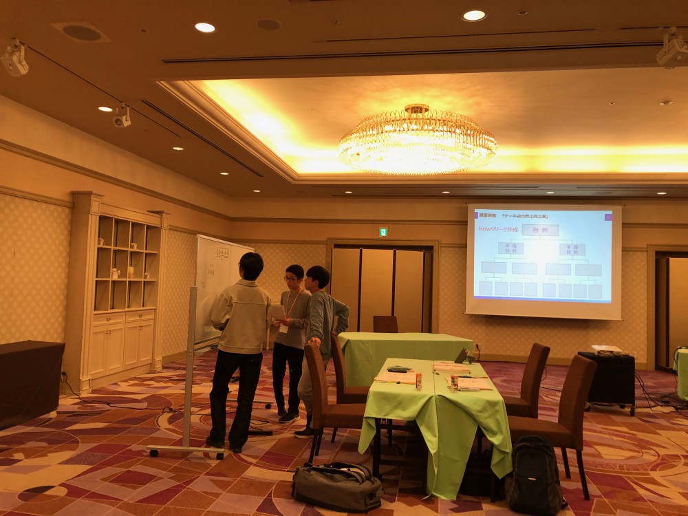 「昨年オープンしたケーキ店の売上向上策」です。店舗を増やさず、外販もせず、来店客に対する販売に絞ってアイデアを出し、ロジックツリーで整理する課題です。ロジックツリーとは、問題の原因を深堀りしたり、解決策を具体化するときに、限られた時間の中で広がりと深さを追求していくのに役立ちます。問題の原因や解決策をツリー状に論理的に分解し整理する方法です。単なるアイデア出しとは違って、問題の本質や具体的な解決策を漏れなく、体系的に導き出すことができます。早速、各グループに分かれ実際にロジックツリーを作成し、プレゼンテーションを行いました。